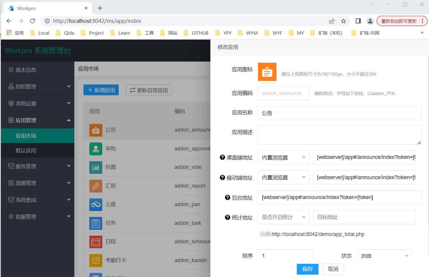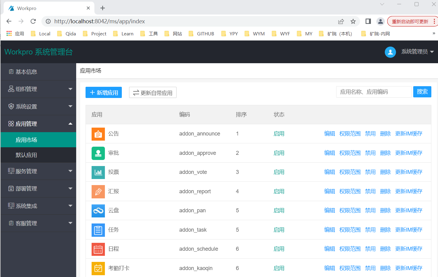 登录WorkPro通后台管理,, 默认地址是 http://服务器地址:9001, 应用管理 / 应用管理 添加应用